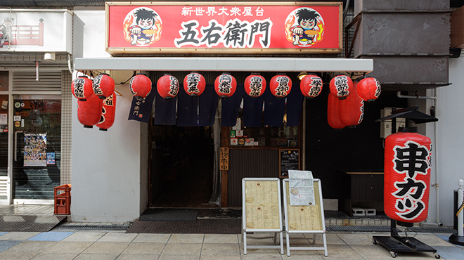 「五右衛門」は大阪・新世界の中心地に位置し、地下鉄御堂筋線・動物園前駅から徒歩約7分、大阪環状線・新今宮駅から徒歩約10分という好立地にあります。